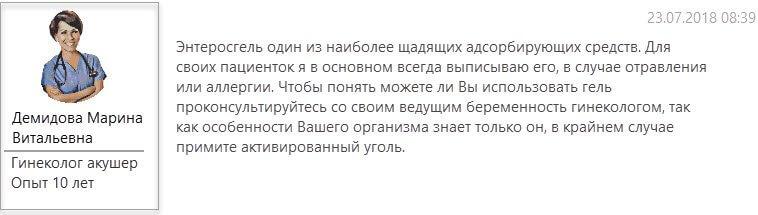 Те женщины, которые во время вынашивания малыша принимали энтеросгель отмечают, что улучшение общего состояния наблюдается уже с первых дней. Никаких побочных явлений не наблюдалось. По их словам, препарат снимает симптомы токсикоза и уменьшает неприятные ощущения практически мгновенно.