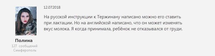 Четкого, однозначного ответа о возможности применения тержинана в период грудного кормления не существует. Все зависит от общего состояния пациентки, стадии заболевания и его сложности и ряда других факторов. Если есть вариант вылечить инфекцию либо инфекцию другими, более безопасными, методами, то стоит воспользоваться ими.